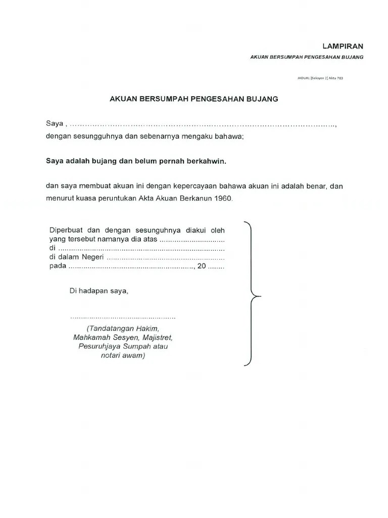 Surat akuan ini hanya boleh diterima pakai sehingga selesai permohonan perkahwinan. Borang akuan sumpah, muat turun. Pengesahan bujang dan belum berkahwin;